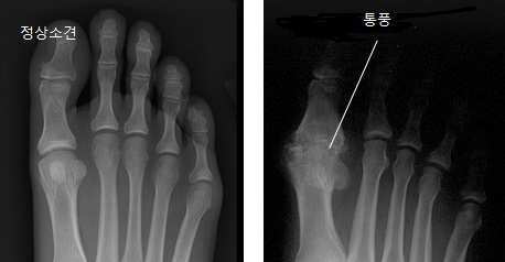 이는 무지가 제1중족지 관절에서 외측을 향하여 경사져 외반되어 있고, 제1중족골은 제2중족골과 멀어지도록 내측으로 기울어 져 있게 되며, 흔히 제1중족골 두부의 내측 비대가 동반되는 병변이다. 그리고 제1중족골 두부의 내측이 비대된 부위에 흔힌 점 액낭(bursa) 이 형성되어 있는데 이를 건막류(bunion) 라 부른다.
