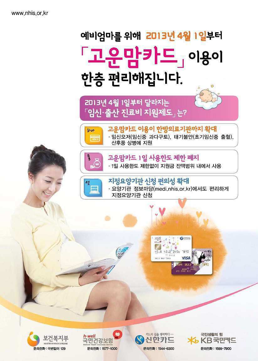 고운맘 카드 안내소생한의원은 고운맘카드를 사용할 수 있는 한의원입니다.한의원에서도 고운맘 카드를 사용 할 수 있습니다.2013.4.1부터 한방의료기관 고운맘카드 확대 시행한방의료기관은초기임신중 출혈(O20), 임신중 과다구토(O21), 분만이 없는 조기진통(O60.0), 산후풍 (U32.7)질환에 적용추나요법 비용생리통 치료 공유