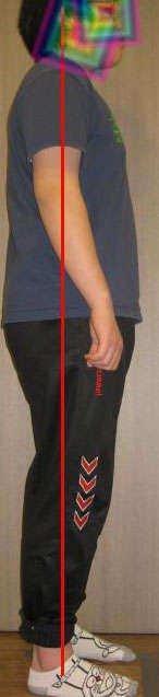 치료 전 뒷 모습에서 좌우 인체 중심 중력선(빨간선)이 매우 불안정한 모습을 보이고 있으나 추나요법 후 매우 안정된 모습으로 변했습니다.