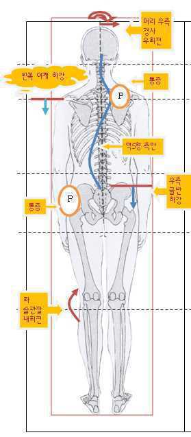 체형을 평가 하는 데는 두 가지 사진이 필요하다 ; 측면과 전후면-- 전후면 자세에서 척추를 보면 측면과 측면의 균형을 보게 된다. 측면에서는 척추의 만곡을 볼 수 있다.
