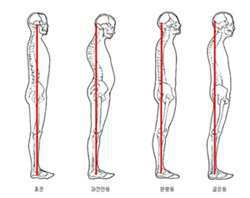 여러가지 체형변화가 일어나지만 거의 대부분 공통적으로 거북목 현상이 일어납니다. 거북목이란 몸통에 비해 목이 앞으로 빠져 나오는 현상을 말하는데 위의 그림에서 중심중력선이 귀를 지나가야 하지만 비정상적인 체형시에는 중심중력선이 귀를 통과하지 못함을 볼 수 있습니다.